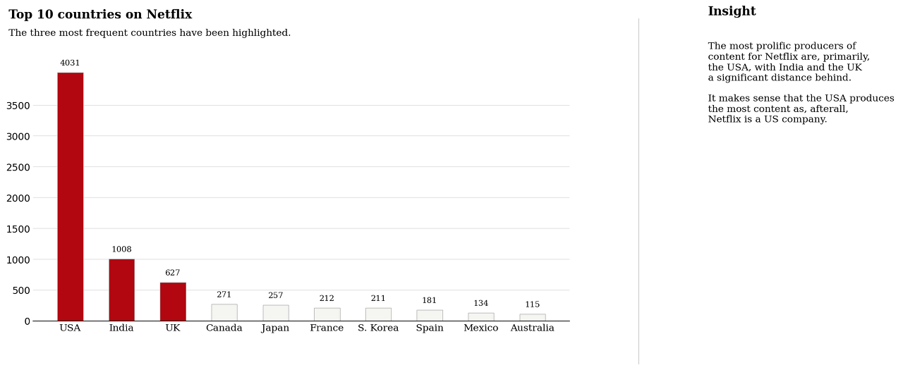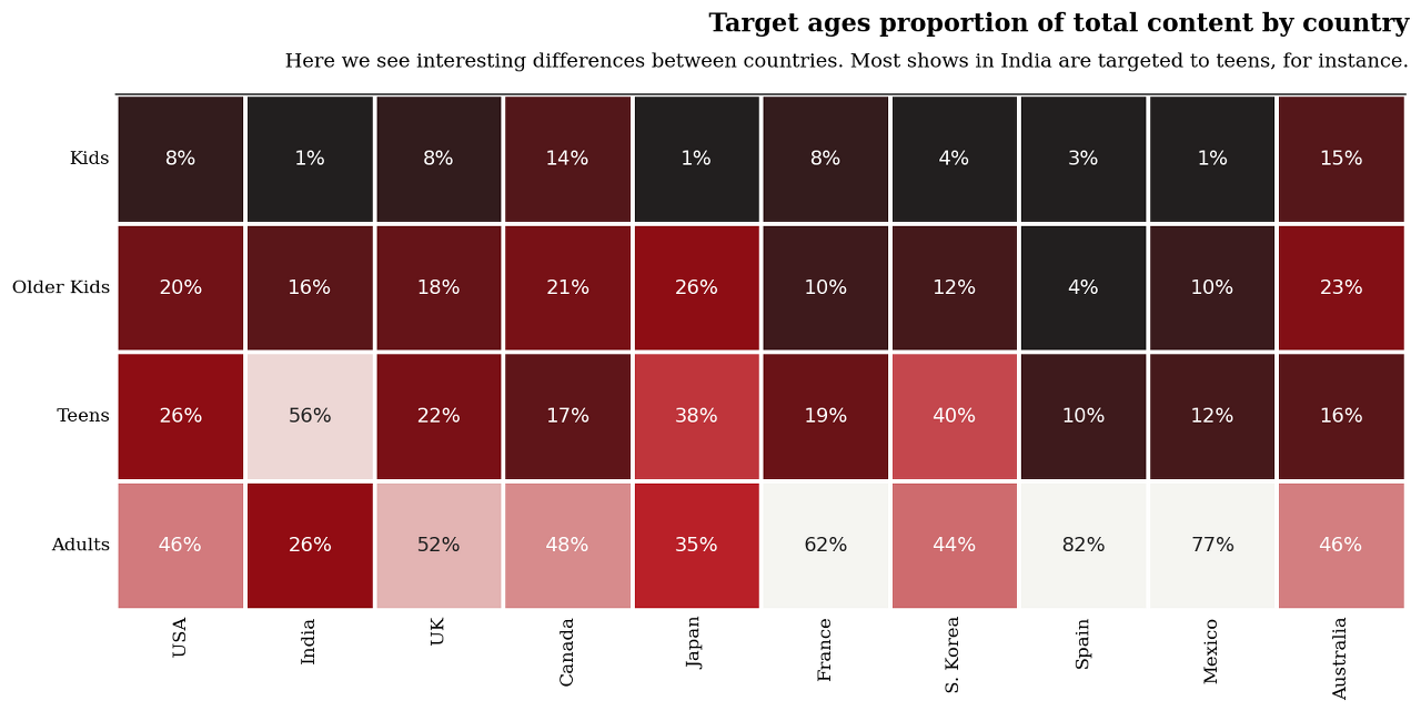 fig.text(0.99, 0.7, 'Here we see interesting differences between countries. Most shows in India are targeted to teens, for instance.',ha='right', fontsize=12,fontfamily='serif')