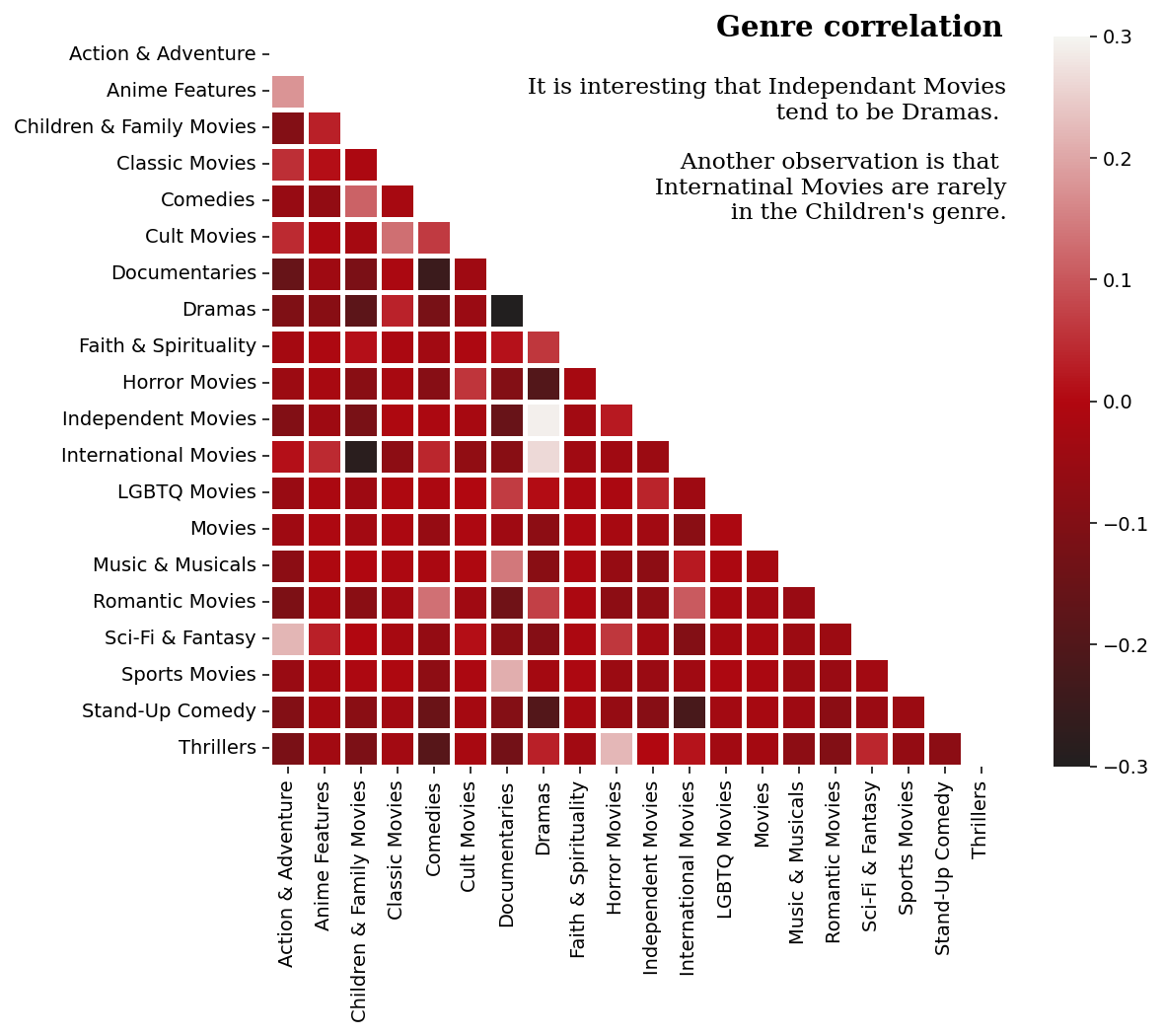 fig.text(.54,.88,'Genre correlation', fontfamily='serif',fontweight='bold',fontsize=15)