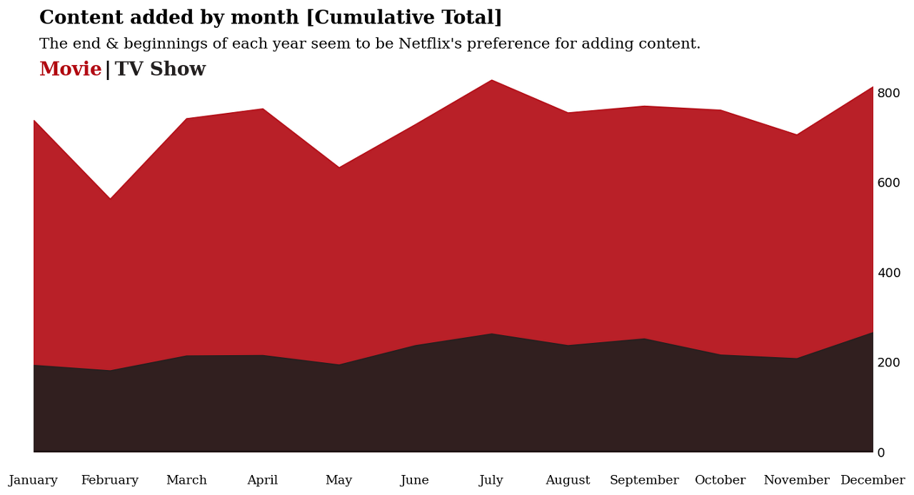 fig.text(0.13, 0.95, 'Content added by month [Cumulative Total]', fontsize=15, fontweight='bold', fontfamily='serif')